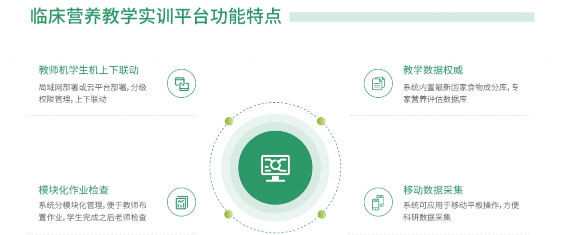 智慧醫(yī)學(xué)營養(yǎng)教學(xué)實(shí)訓(xùn)平臺(tái)系統(tǒng)是一款基于局域網(wǎng)/互聯(lián)網(wǎng)技術(shù)的臨床膳食營養(yǎng)實(shí)訓(xùn)教學(xué)的專業(yè)應(yīng)用軟件平臺(tái)。它由營養(yǎng)配餐系統(tǒng)、營養(yǎng)分析系統(tǒng)、營養(yǎng)評(píng)價(jià)系統(tǒng)、營養(yǎng)計(jì)算系統(tǒng)、營養(yǎng)監(jiān)測(cè)、營養(yǎng)建議、營養(yǎng)查詢庫、運(yùn)動(dòng)能耗等八大子系統(tǒng),結(jié)合膳食營養(yǎng)教學(xué)中的運(yùn)動(dòng)能耗計(jì)算、疾病營養(yǎng)查詢、營養(yǎng)標(biāo)簽等模塊組成。一套軟件徹底解決臘食營養(yǎng)教學(xué)中的配菜、配餐、分析、評(píng)估,計(jì)算、查詢、食品標(biāo)簽等問題。